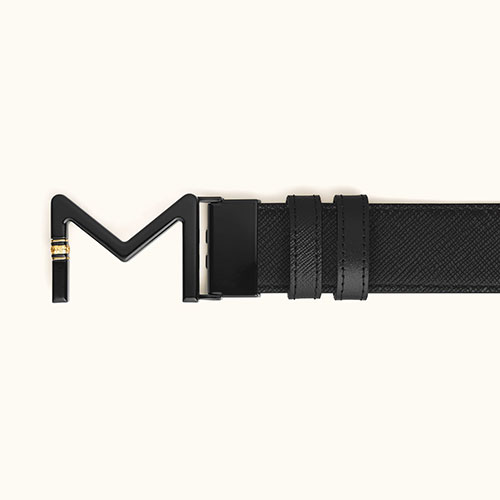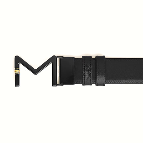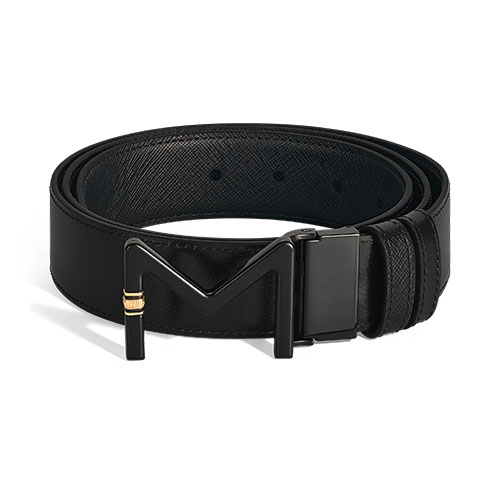 Coniugando la tradizione Montblanc nella cultura della scrittura e nel design degli accessori, la cintura reversibile da 30 mm in pelle presenta una fibbia con una caratteristica forma a M finitura nera lucida e dettagli oro, che richiamano con discrezione l’iconico strumento di scrittura. Grazie alla sua reversibilità, la cintura offre due diverse opzioni di stile: un lato è in pelle di vitello nera con stampa Sartorial dal un look testurizzato, l’altro è in pelle Meisterstück nera, adatta a ogni occasione.