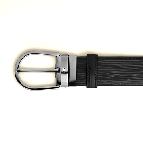 Trasforma ogni outfit in una dichiarazione di stile con questa cintura da 35 mm in pelle nera decorata con un motivo a corteccia stampato unico e una fibbia ad ardiglione a ferro di cavallo finitura rutenio lucido.