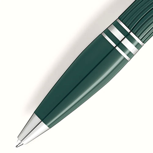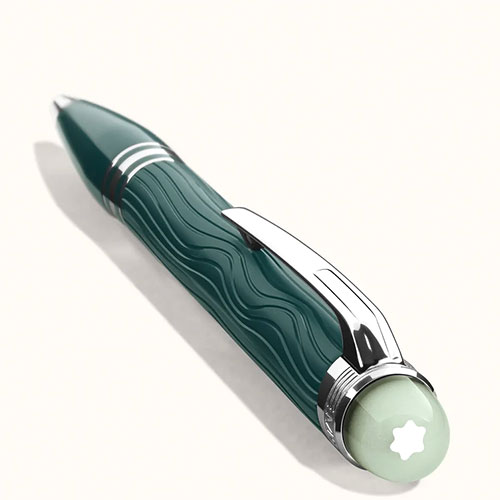 La StarWalker PolarGreen cattura la magia dell’aurora boreale. Sulla Terra, gli esseri umani possono alzare lo sguardo al cielo e lasciarsi trasportare dalla meraviglia di questo grandioso spettacolo. La cupoletta sulla parte superiore del cappuccio, realizzata in resina trasparente, si illumina in penombra, evocando le affascinanti danze luminose del cielo notturno. Il motivo a onde sulla pregiata resina verde del cappuccio e del corpo riproduce magnificamente i riflessi cangianti dell’aurora boreale e la finitura opaca ne esalta i riflessi. Gli anelli in resina verde scuro della parte anteriore esaltano i dettagli finitura platino della penna a sfera.